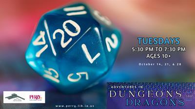 Welcome to a world of Dungeons and Dragons! Dungeons and Dragons is a communal storytelling adventure where you get to play a character of your own creation and make decisions (and rolls) to decide the path of our story and the destiny of your character! Our adventures are enjoyable for newcomers and experienced players alike. Patrons 10+ are invited to join us as we venture into exciting campaigns in the Perry Public Library Community Room on Tuesday nights in October from 5:30 pm to 7:30 pm. This is a free program and no registration is required. For more information, go to www.perry.lib.ia.us, visit the library, or call 515-465-3569.