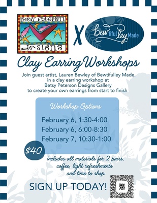 Join guest artist, Lauren Bewley of Bewtifulley Made, in a clay earring workshop at Betsy Peterson Designs Gallery to create your own earrings!
